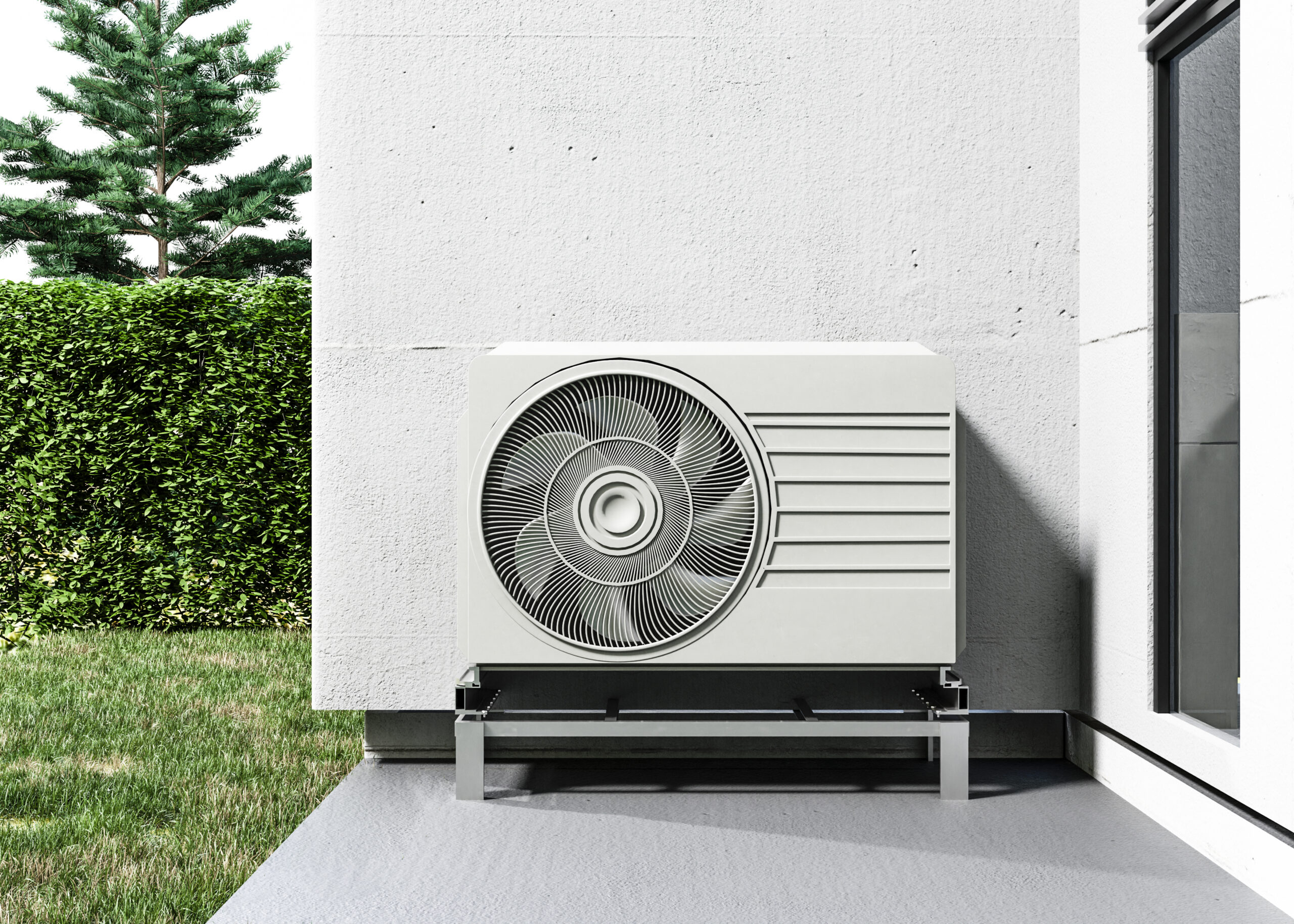 close-up shot of grey air conditioner hanging on white brick wall